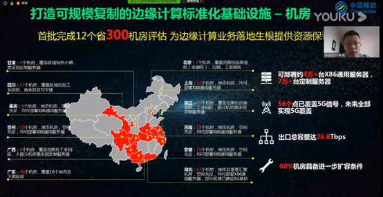 中国移动研究院网络所边缘计算研究室主任耿亮表示,2019年中移动完成了12个省300机房评估 为边缘计算业务落地生根提供资源保证,可部署约4万多台X86通用服务器,7万多台定制服务器,56个点已覆盖5G信号,未来将全部实现5G覆盖 ,出口总容量达26.8Tbps ,且60%机房具备进一步扩容条件。