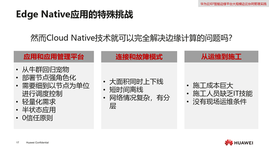 以上讲了使用Cloud Native解决的一些问题,Cloud Native无法完全解决边缘计算的问题,边缘节点有不同的特点,分为三个方面:应用和应用管理平台、连接和故障模式、从运维到施工。