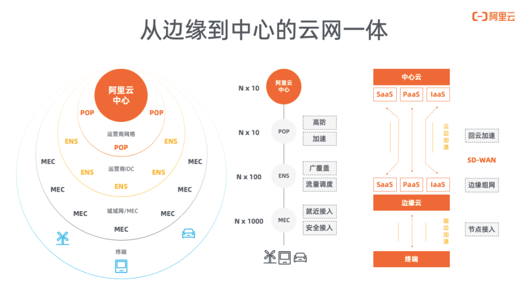 5G让边缘计算可以继续下沉到城域网,主要是用于地市一级就近计算和流量调度,MEC节点离终端更近一步,通过将终端的算力进行局部集中带来一部分算力集约收益,而且5G释放出来更多的终端到边缘的网络传输质量管控能力,能够优化边到端服务质量,达到降低成本的同时并不会太多的降低用户体验。最终通过一个整体从云到边再到端的网络体系形成了云网一体化的能力,让不同的业务在一体化的形态中找到最适合自己的计算分布形态,阿里云构建全面的网络加速,就是计算在每个环节上起到黏合剂的作用。