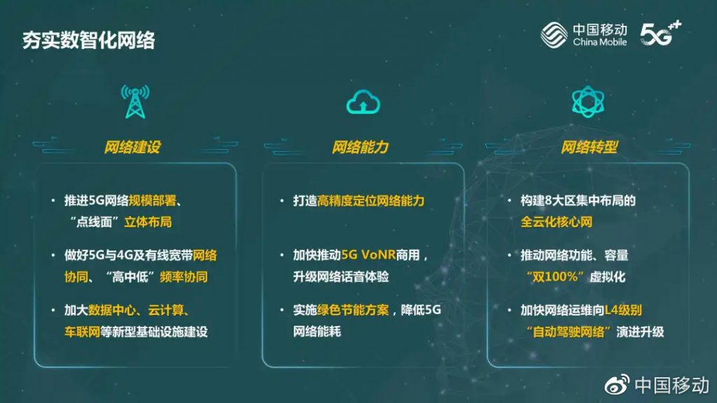 二是夯实数智化网络。我们正努力构建云网一体、高度自动化、智能化的网络体系,充分发挥运营商的核心优势,夯实各行各业数智化转型基础。在网络建设方面,推进5G规模化部署和“点线面”立体布局,做好5G和4G及有线宽带网络协同、“高中低”频率协同;同时,加大数据中心、云计算、车联网等新型基础设施建设;在网络能力方面,不断增强特色能力,打造高精度定位网络能力,加快推动5G VoNR商用,实现话音体验升级,通过绿色节能方案,持续降低5G网络能耗;在网络转型方面,深化网络云化、虚化、智能化转型,构建8大区集中布局的全云化核心网,推动功能、容量实现“双100%”的虚拟化,加快网络运维向L4级别“自动驾驶网络”演进升级。