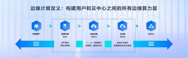 讲到边缘计算,跟大家分享一下我们对边缘计算的定义,我们将用户到云中心之间所有的算力层都定义为边缘计算的范畴,包括:现场边缘、近场边缘、云边缘三层,覆盖5-40ms时延范围,提供从用户现场,到本地城市节点以及区域中心汇聚节点等多种异构算力资源,根据地理位置的分布,提供单线、多线等多种网络接入能力,确保用户就近接入,满足业务超低时延的算力调度和网络能力的需求。